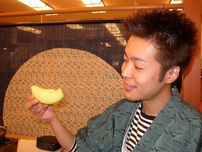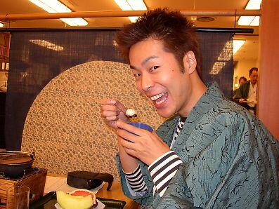 | 夕食はバイキング。品数は豊富だ。あれやこれやと迷いながら、たんまり皿に盛り付ける。しかし、そこはやはりバイキング。味に「期待」してはいけませぬ・・・。そして僕達お得意の余興が始まる。ある設定を決めての「おふざけ写真撮影」だ。今回は、「高橋功“アイドル風”旅番組・料理紹介コーナー」だ。僕は、カメラマンに指示される通りにポーズを撮り、顔を作る。皆してこの遊びになると、真剣だ。きっと、側で見ていた従業員は、「いい年して何やってんだ・・・やれやれ」と思いながら見ていたはずである。しかし、旅の恥はかき捨て。二度と会うこともない従業員の目など、気にもならない。 |